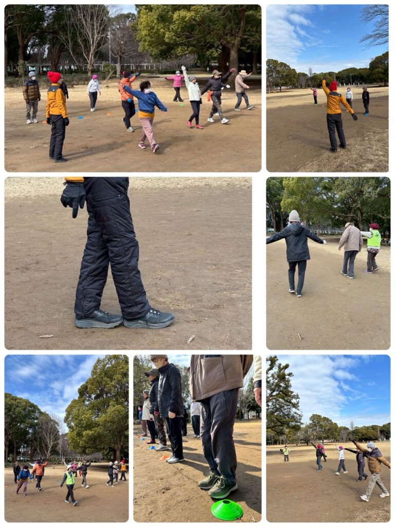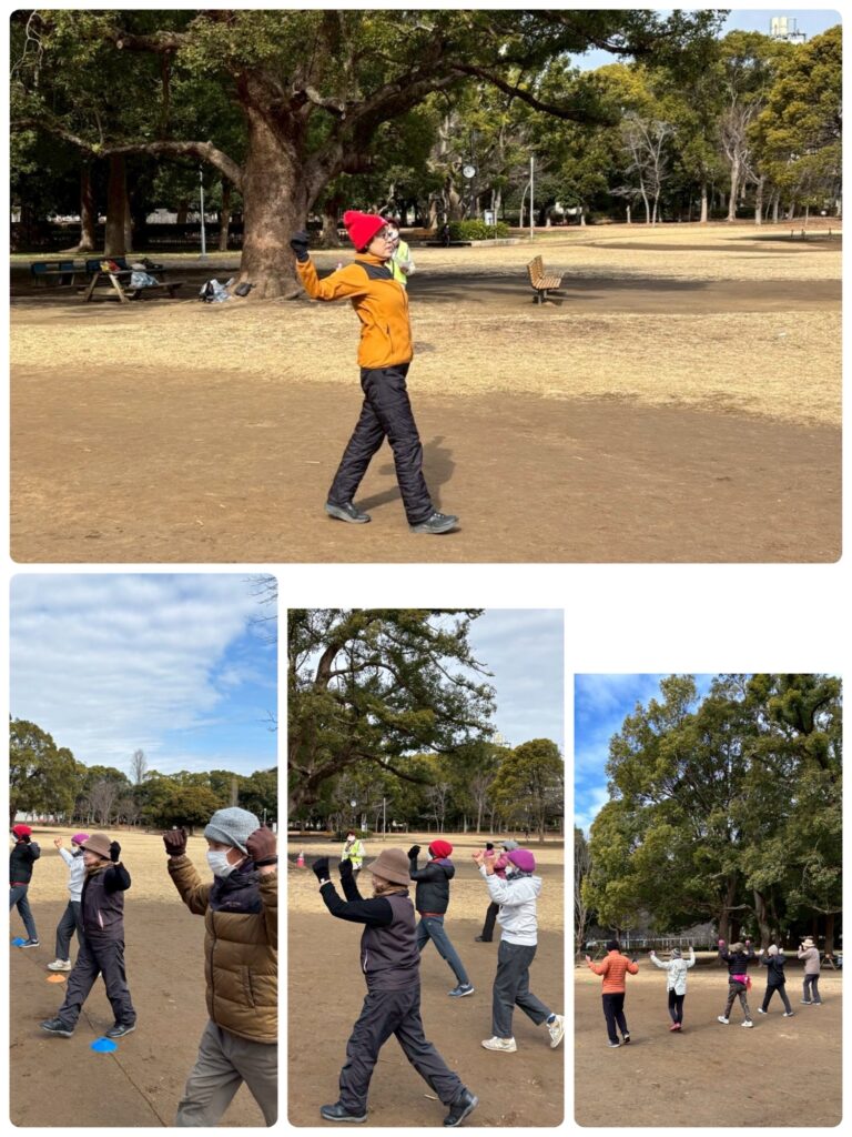 踵(少し前)からつま先への重心移動。 肩回し、腕回し、呼吸ウォーク